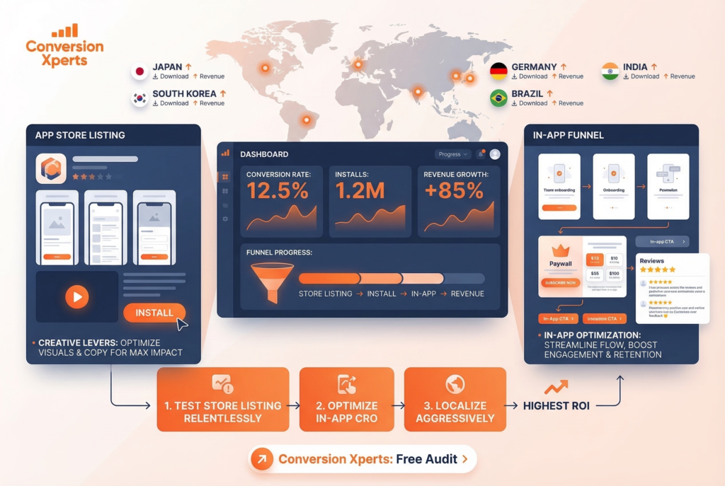 The three key takeaways from this guide: First, treat your app store listing as a sales page and test it relentlessly icon, screenshots, and preview video are your most powerful creative levers. Second, extend your CRO mindset deep into the app — your first session, your paywall design, and your review strategy all have enormous conversion headroom. Third, localize aggressively the 72% download lift from proper localization is the single highest-ROI action most teams aren’t taking.